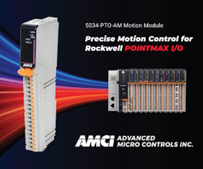 AMCI’s 5034-PTO-AM delivers high-speed pulse train output for Rockwell’s PointMax™ I/O platform. Built for precise motion control, it integrates seamlessly with Allen-Bradley PLCs, reducing cabinet space, simplifying wiring, and bringing motion control closer to the point of use.