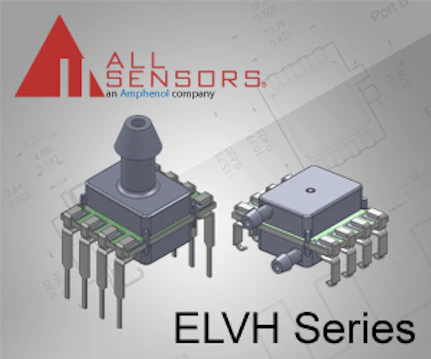 Amphenol All Sensor’s ELVH Series pressure sensors are available in pressure ranges from 0.5 inH2O through 150 PSI, including millibar calibrations. The series is compatible as a replacement for alternate suppliers. Outputs include digital I2C or SPI in 14-bit output or ratiometric analog. Various lead and port options are available, as is an optional parylene coating for moisture or harsh media protection.