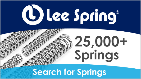| | | | Sponsored | Lee Spring offers over 25,000 stock springs, plus extensive capabilities to manufacture custom springs, wire forms, stampings and fourslide parts. Search for Compression Springs, Extension Springs, Torsion Springs, HEFTY™ Die Springs, LeeP™ Plastic Composite Springs, REDUX™ Wave Springs, Belleville Washers, Constant Force Springs and more. |