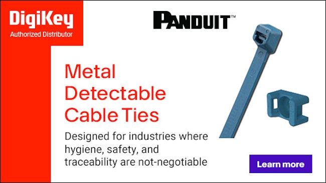Panduit's metal-detectable cable ties are designed to help the food and beverage industries meet product manufacturing safety standards. Featuring metal-impregnated material, these cable ties are identifiable by metal detection equipment. Additionally, their antimicrobial properties help to reduce the growth of bacteria, fungis, and mold.