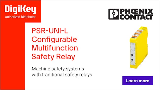 | | | | | | Sponsored | Phoenix Contact’s PSR-UNI-L safety relay monitors up to two safety sensors in one device. Choose UNI-1 for single-circuit control or UNI-2 for dual independent circuits. With configurable outputs and AOI compatibility, it delivers flexible, reliable protection for emergency stops, door switches, light curtains, and magnetic sensors. |