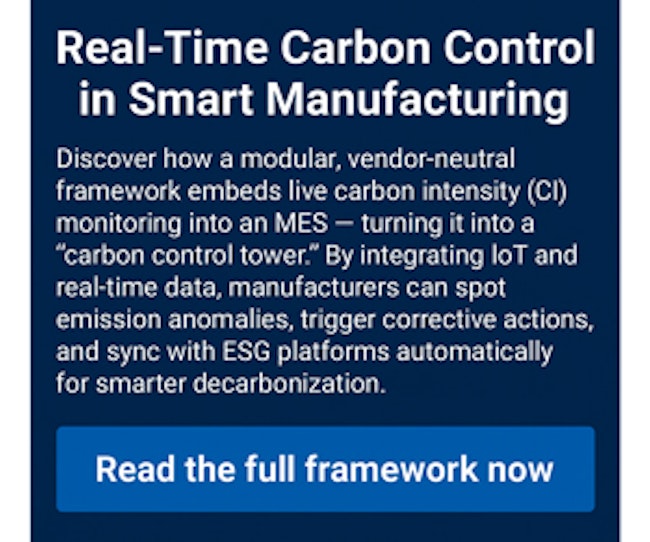 | | | | | | Sponsored | | Discover how a modular, vendor-neutral framework embeds live carbon intensity (CI) monitoring into an MES — turning it into a “carbon control tower.” By integrating IoT and real-time data, manufacturers can spot emission anomalies, trigger corrective actions, and sync with ESG platforms automatically for smarter decarbonization. |